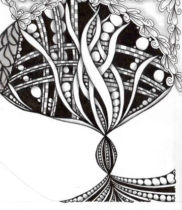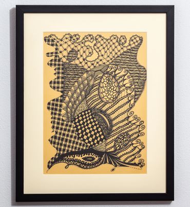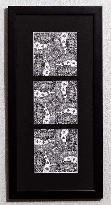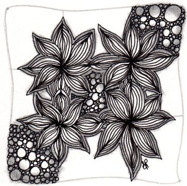 Every origami piece began with pen and ink with pencil shading on a 3.5” x 3.5” square paper tile. I scanned each piece of Zentangle artwork, duplicated and rotated it using simple graphic design, printed it and folded it to create origami stars, flowers and dodecahedrons (12 sided shapes). Each origami star / flower required 3, 5, or 7 pieces of identically