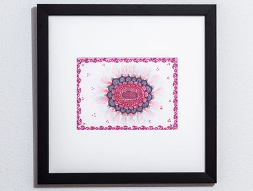 Galaxy is comprised of over 70 individually folded origami stars/flowers. Each piece began with pen and ink and pencil shading on a 3.5" square paper tile. I scanned each piece of Zentangle artwork, duplicated and rotated it using simple graphic design, printed it and folded it. Each origami star / flower required 3, 5, or 7 pieces of identically patterned paper. To learn how to fold an origami
