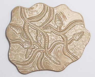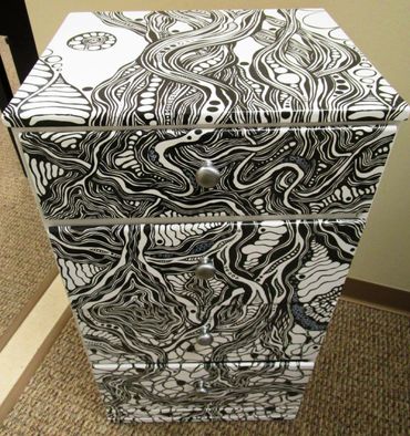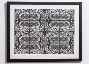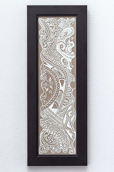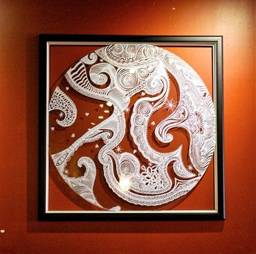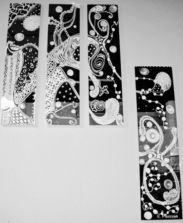 This show includes 18 original pieces of art on 2" square paper tiles, 33 hand drawn 10-pointed origami stars, and 7 black/gray & white origami stars made from original patterns on printed paper.